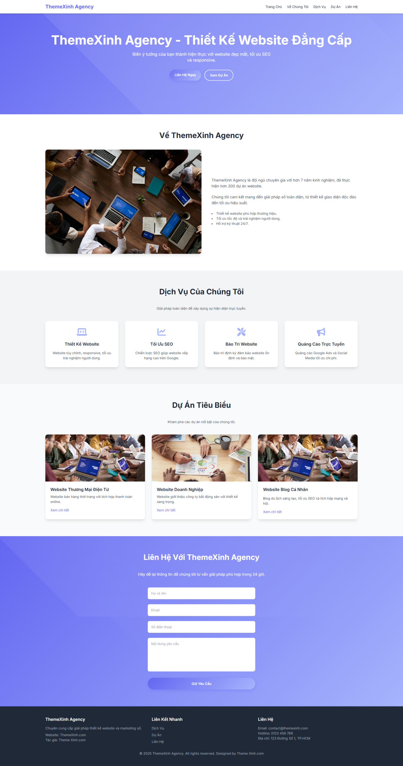 ThemeXinhAgency là lựa chọn tuyệt vời để tạo ra một website chuyên nghiệp, dễ sử dụng, kết hợp sức mạnh của HTML hoặc Next.js để đáp ứng mọi nhu cầu phát triển web hiện đại.